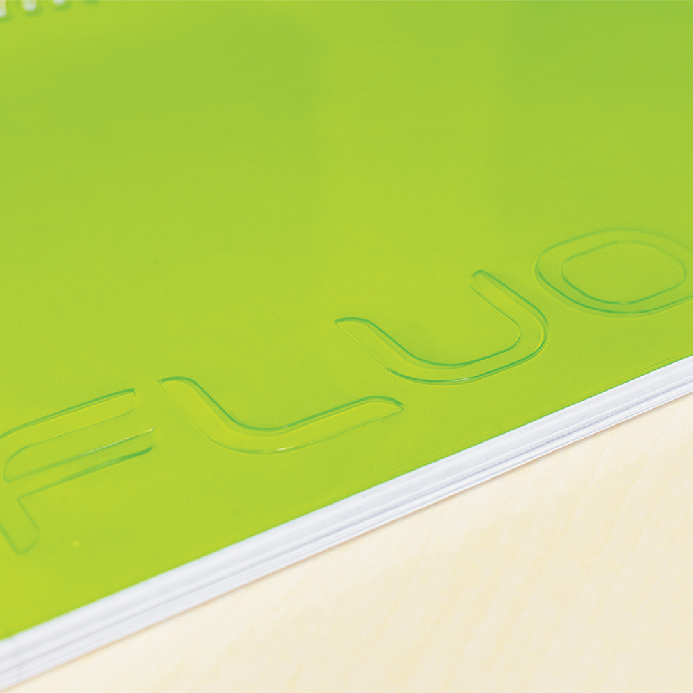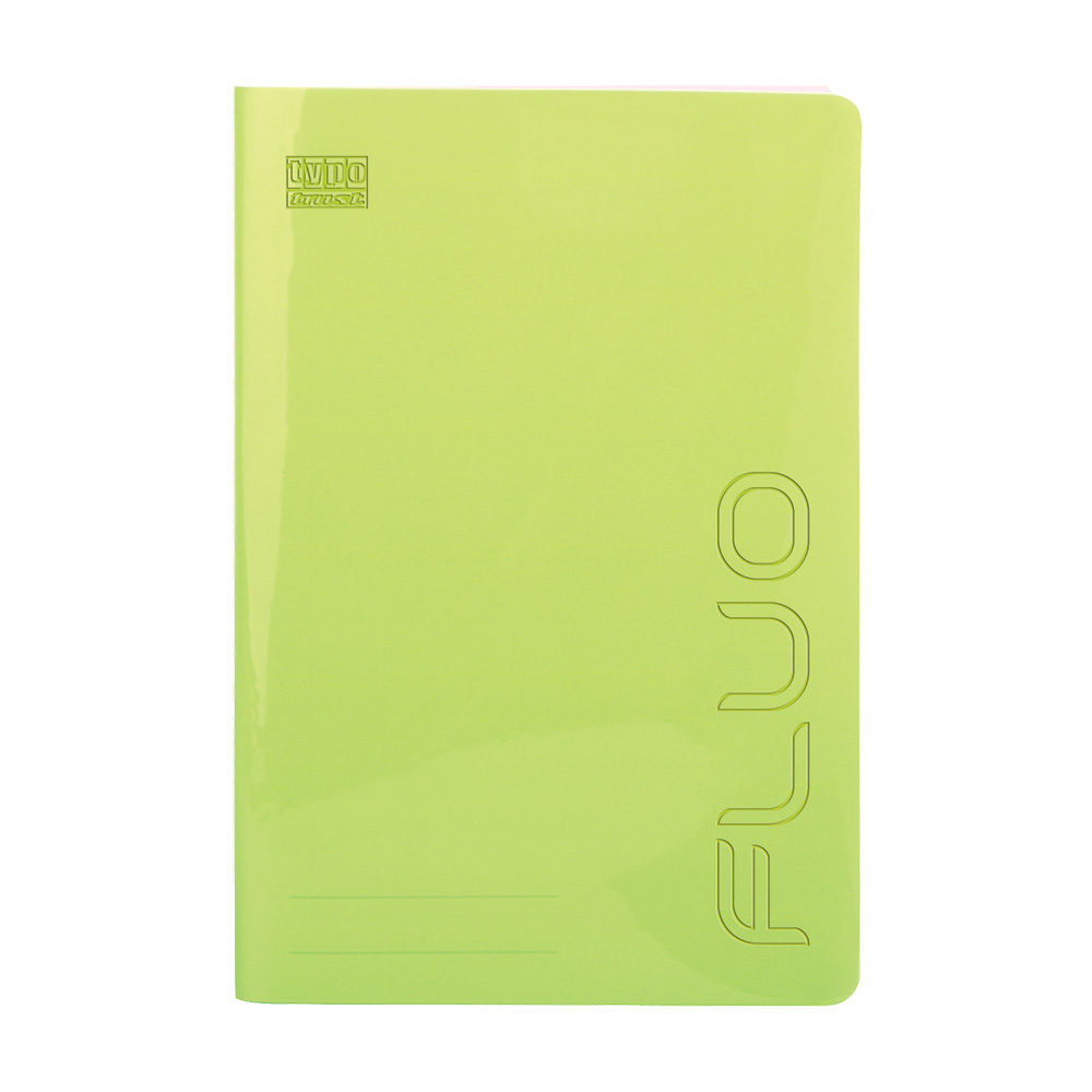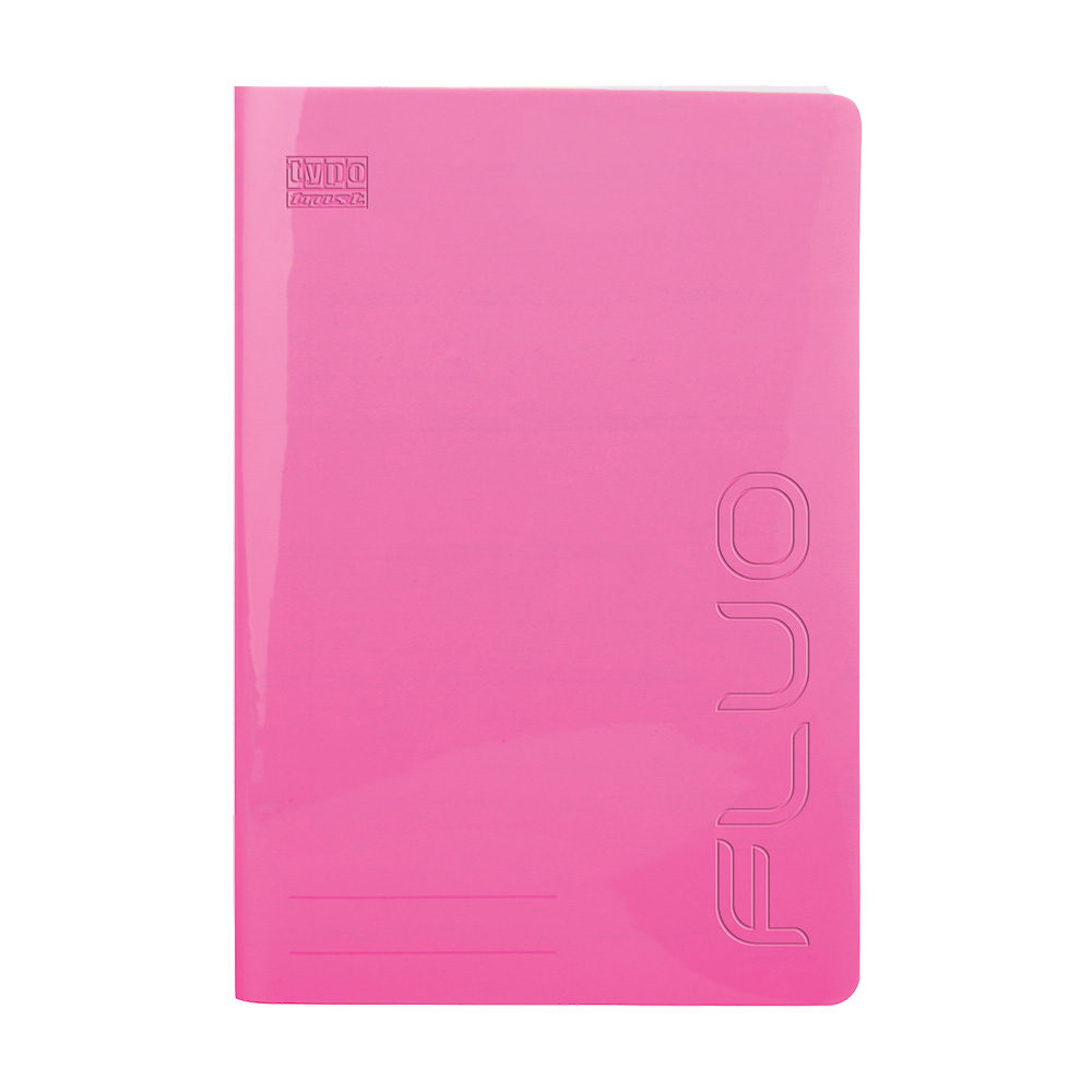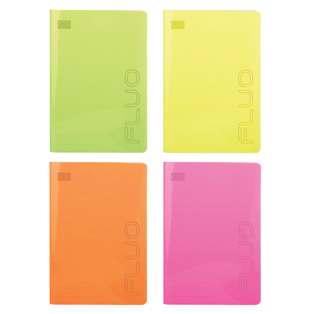 Fluo τετράδιο B5 (17x25). Με χρωματιστό διάφανο πλαστικό εξώφυλλο. Τα φύλλα είναι από εξαιρετικής ποιότητας χαρτί 70γρ. και η γραμμογράφηση είναι ριγέ με σωστές αποστάσεις. Διατίθεται σε 4 χρώματα (ροζ, πορτοκαλί, κίτρινο, λαχανί). Η συσκευασία είναι ανάμεικτων χρωμάτων σε πακέτο των 12 τεμαχίων.